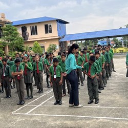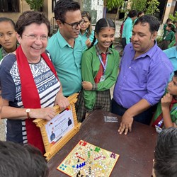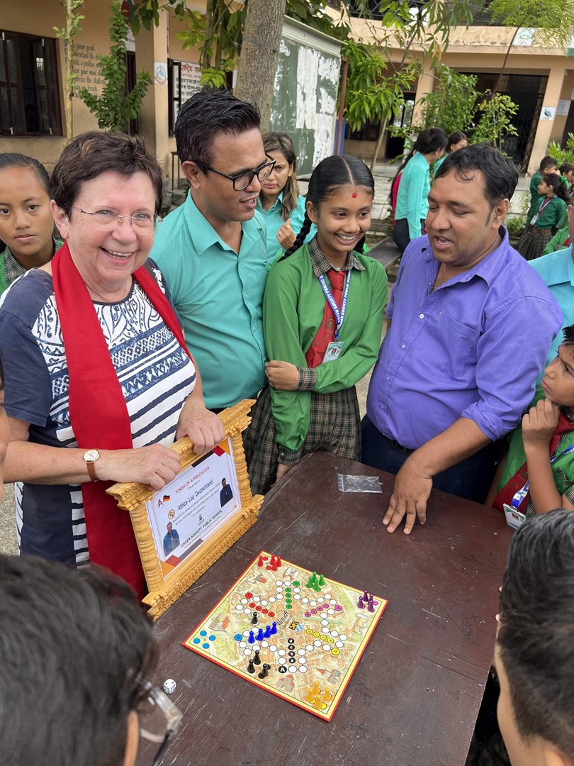 Ein phänomenaler Empfang mit Gänsehaut-Feeling erwartete die Gäste in der Schule. Lehrerschaft und Kinder stimmten die nepalesische Nationalhymne an, bevor aus den Lautsprechern das Deutschlandlied erklang. Deren 3. Strophe wurde selbstverständlich von den drei Gästen mitgesungen. Aktuell besuchen 450 Kinder im Alter zwischen 6 und 16 Jahren die Schule. Die Klassen sind mehr als voll. Die Lehrkräfte sind offenkundig sehr engagiert, bereiten die Kinder mit viel Liebe und Können auf ihr zukünftiges Leben vor. Rund ein Drittel der Kinder kommt aus sehr armen Verhältnissen. Dass sie kein Schulgeld zahlen müssen, machen die zahlenden Kinder möglich. Das gilt auch für die Vier- bis Sechsjährigen in den Vorschulgruppen. Hoch erfreut war das Besuchertrio darüber, dass sich unter den Kindern auch solche aus Chepang-Familien befanden. Sie erhalten nach dem Unterricht im Prof. Dausch-Kinderhaus ihr Mittagessen. Anschließend werden sie dort betreut. Sie übernachten in einem am Ortsrand von Sauraha gelegenen Haus. Zum Abschluss ihrer Schulvisite überraschte Bärbel Birner Schulleiter, Lehrkräfte und Kinder mit einem originellen Geschenk. Sie überreichte vier Mensch-ärgere-dich-nicht-Spiele mit dem ausdrücklichen Hinweis, dass das Spiel 1907 von Josef Friedrich Schmidt, einem gebürtigen Amberger, erfunden wurde.