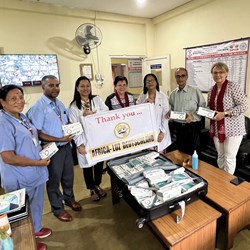 Erste Station war das Krankenhaus. Im Eingang stach sofort ein großes Bild zu Ehren von Prof. Dausch und Bärbel Birner ins Auge. Vor dem Gebäude wartete eine Menschenschlange. Drinnen untersuchte eine einheimische Augenärztin zusammen mit einer Optometristin die Patienten. Deren Gesichter erhellten sich spontan beim Anblick der mitgebrachten Augentropfen, Diabetes-Messgeräte, Blutdruckgeräte und verschiedener Medikamente.